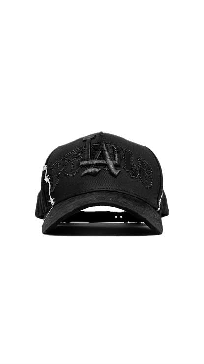 Esta gorra Fino X Tito doble p es el accesorio perfecto para añadir un toque de estilo a cualquier atuendo. Con una pedrería brillante al frente y un bordado de alambre de púas alrededor, esta gorra seguramente llamará la atención. Además, está hecha con materiales de alta calidad para brindar durabilidad y comodidad. ¡No te pierdas la oportunidad de lucir a la moda con esta gorra única!